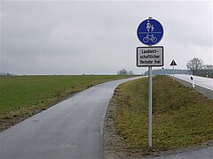 Im Landkreis Schweinfurt sind viele Straßen begleitende Rad- und Fußwege (StVO Zeichen 240) auch für den landwirtschaftlichen Verkehr freigegeben (Zeichen 1026-36, Landwirtschaftlicher Verkehr frei).