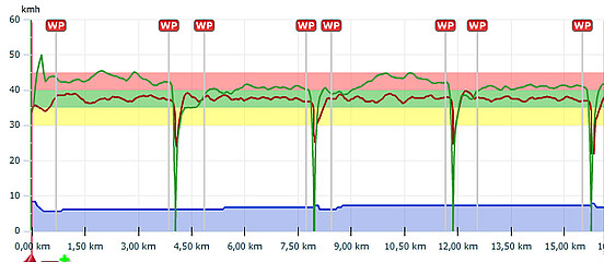 Bild 2: Messschrieb Mango offen. WP sind Messstart und -stopp. Rote Kurve = Puls, der grüne Bereich ist 140 .. 160 bpm. Grüne Linie = Geschwindigkeit.