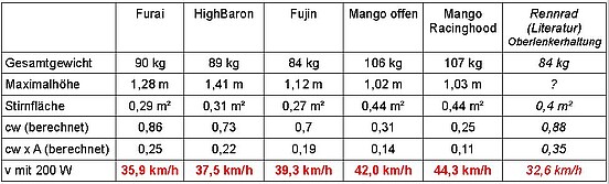 Die ermittelte Geschwindigkeit habe ich nun für eine vergleichende Berechnung der Liegeräder benutzt.