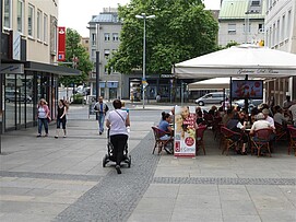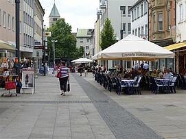 In der Spitalstraße sind Bereiche für die Sondernutzung von Gewerbebetrieben ausgewiesen, d.h. anliegende Betriebe nutzen die öffentliche Fläche mit Bestuhlung (Cafes) oder Werbeaufstellern, Hinweisschildern, Warentischen. Dadurch wird der zur Verfügung stehende Verkehrsraum weiter eingeschränkt. Dank der Breite der Spitalstraße ist es aber kein Problem, dass die Gewerbetreibenden, Fußgängern und Radfahrer diese gemeinsam nutzen.