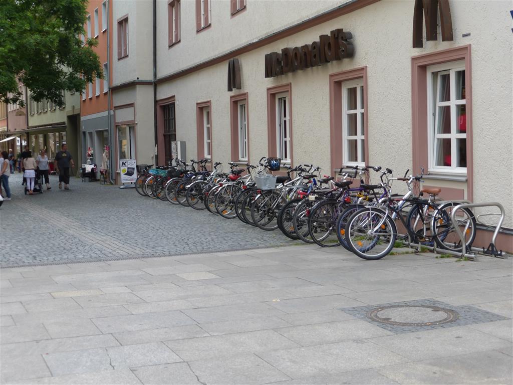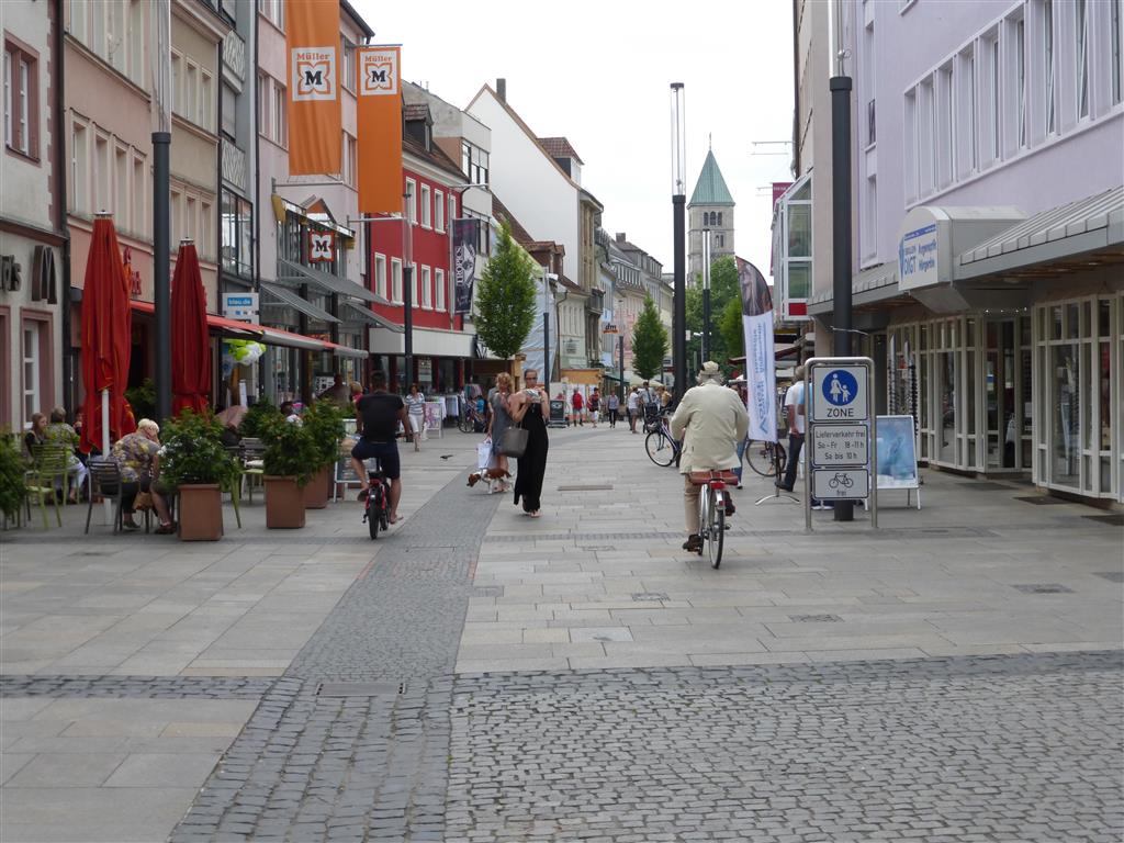 In der historischen Innenstadt Regensburgs bewegen sich in engen Gassen, auf mit Geschäften gesäumten Plätzen, gemeinsam Fußgänger, Radfahrer und Kfz auffallend harmonisch, völlig entspannt und rücksichtsvoll. Es scheint also auch ohne Verbote und gegenseitige Schuldzuweisungen zu gehen.