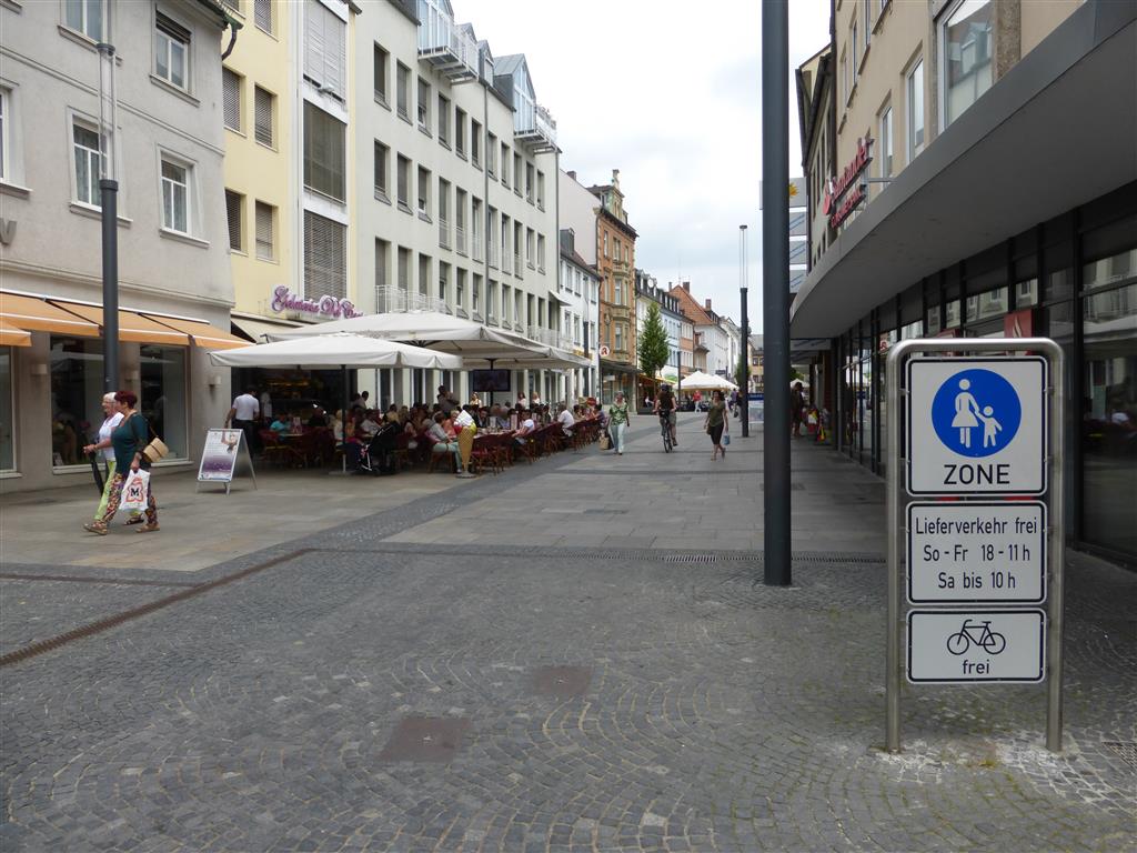 Die Spitalstraße in Schweinfurt ist als Fußgängerzone ausgewiesen, Zeichen 242.1 STVO (Beginn einer Fußgängerzone), die jedoch durch Zusatzbeschilderung für den motorisierten Lieferverkehr (PKW, LKW) So – Fr von 18 bis 11 Uhr, Sa nur bis 10 Uhr, befahren werden darf.